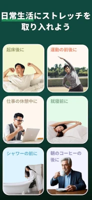 どこにいても、特別な器具は一切不要。JustStretchは、リビングルームやオフィス、旅先など、あらゆる場所であなたのトレーニングを可能にします。全身の主要な筋肉から、肩、腰、股関節といった特定の部位に特化したプログラムまで、広範囲にわたるストレッチコンテンツを提供。柔軟性の向上、痛みの軽減、姿勢の改善、ストレス緩和、さらには運動パフォーマンスの向上といった多岐にわたるメリットを実感できます。Daily Bendが提供するJustStretchは、シンプルでありながら効果的なアプローチで、あなたのウェルネスジャーニーを力強く支え、心身ともに豊かな日常を実現します。