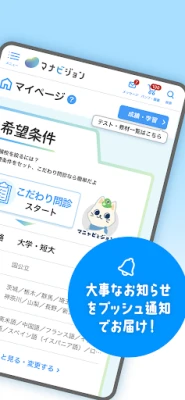 進路に関する重要な最新情報は、アプリからの通知でリアルタイムにお知らせ。変化の激しい入試情報をいち早くキャッチし、常に一歩先の準備を進められます。未来を切り開くあなたの挑戦を、「マナビジョン」が力強くサポート。一部の機能は、学校から配布される特定のログインIDをご利用いただくと、さらに便利に活用いただけます。
