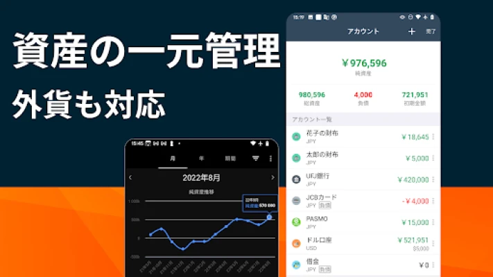 私用、ビジネス、旅行など、用途に応じた複数の家計簿を「毎日家計簿」一つで一元管理。海外での現地通貨利用にも対応し、自動で日本円に換算されるため、グローバルな支出も迷うことなく記録できます。さらに、現金、預金、クレジットカード、電子マネーといった様々な資産を一箇所で把握し、口座連携なしでも残高の動きが手に取るように分かります。為替レートの自動更新機能は、外貨アカウントを持つ方にとって大きな安心材料となるでしょう。